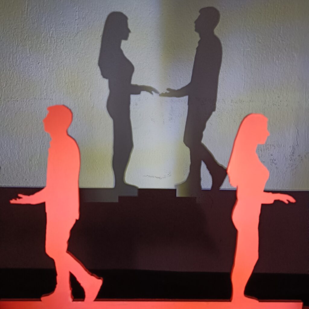 Forget the shadow. See just the sculpture. On the sculpture you can see Romeo, who excists and has gone to Juliet’s garden (you can notice some flowers and various other garden decorations) and he is looking for her. But he is looking for her desperately because it’s the moment of the story that he knows that Juliet is dead. She does not exist, in his mind, as a natural person, but she is only a thought. That’s why Juliet appears only on the shadow. Intangible – immaterial. And, she has this strange shape because in his mind he has begun to disappear (parts of her are missing).